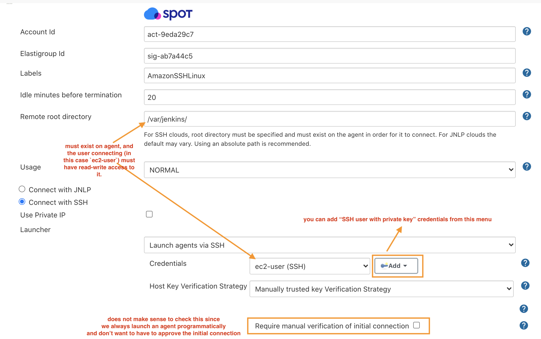 As described in the screenshot, setting the Remote Root Directory is a must for SSH clouds. Note that the path in the example (/var/jenkins) matches the one we assign to the user (ec2-user) in the startup-script in the previous section.